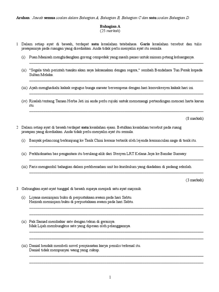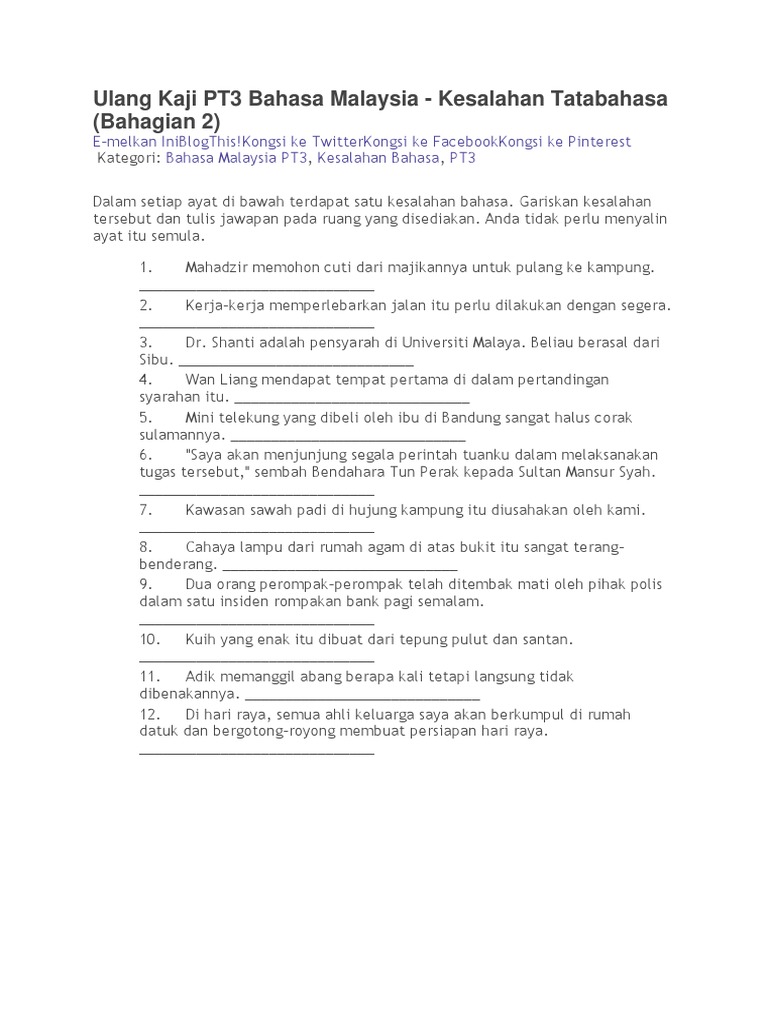 . Latihan Bahasa Melayu Tahun 6. Ayat akan menjadi tidak sempurna dan tergantung. Dalam setiap ayat di bawah ini terdapat satu kesalahan tatabahasa.